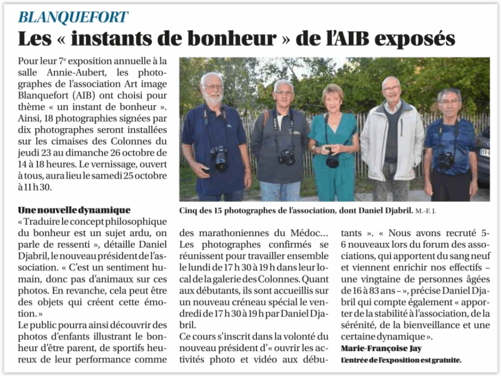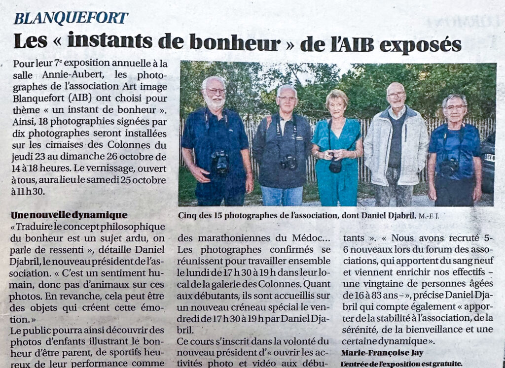 C’est le thème « Un instant de bonheur » qui a été choisi pour l’exposition annuelle d’Art’Image Blanquefort. De nombreux visiteurs ont pu voir les photos aux multiples déclinaisons que nos membres ont réalisées pour retranscrire ce sentiment.